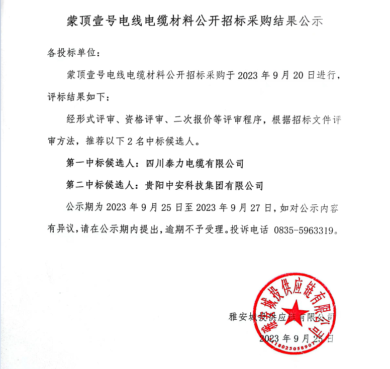 蒙頂壹號(hào)電線電纜材料公開(kāi)招標(biāo)采購(gòu)結(jié)果公示