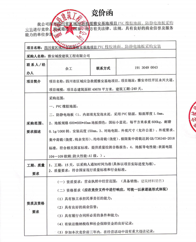 四川省區(qū)域應(yīng)急救援雅安基地項(xiàng)目PVC橡膠地面、防靜電地板采購(gòu)安裝競(jìng)價(jià)公告