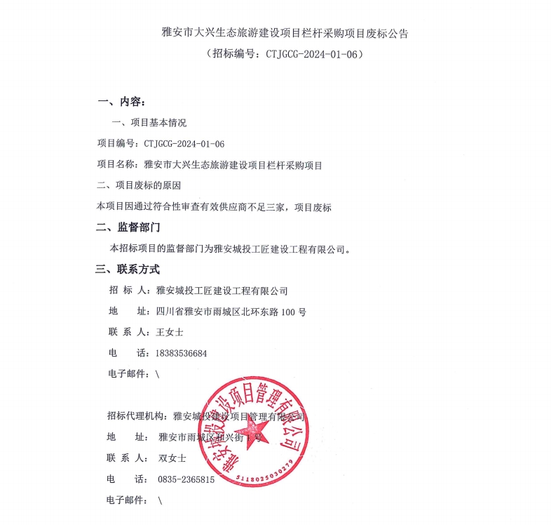 雅安市大興生態(tài)旅游建設項目欄桿采購項目廢標公告