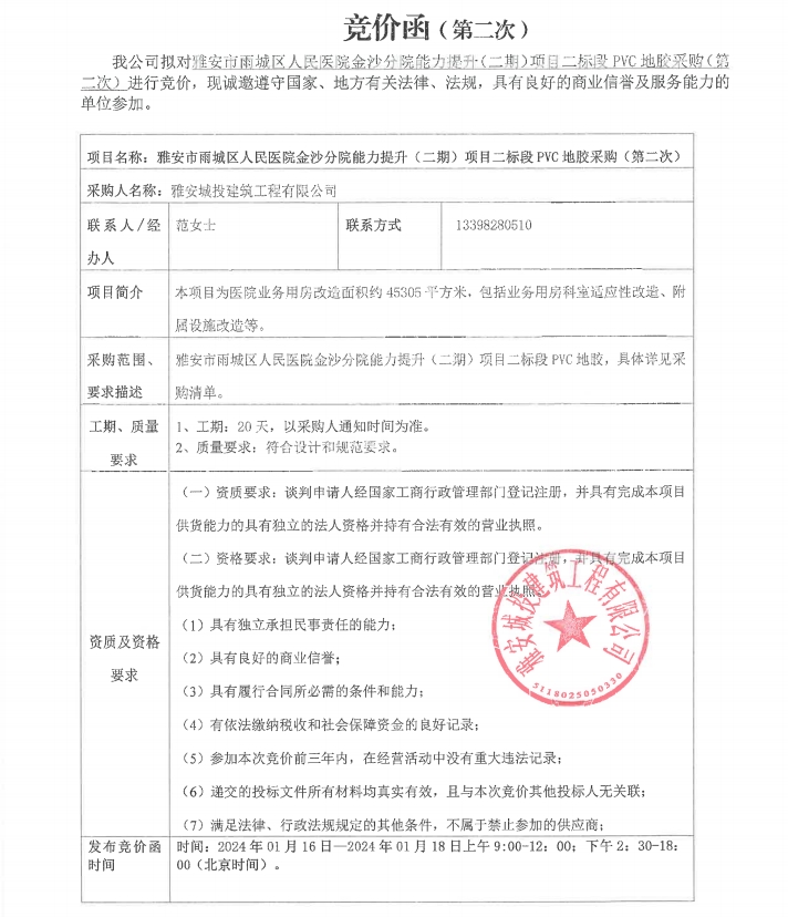 雅安市雨城區(qū)人民醫(yī)院金沙分院能力提升(二期)項(xiàng)目二標(biāo)段PVC地膠采購(第二次)競價(jià)公告
