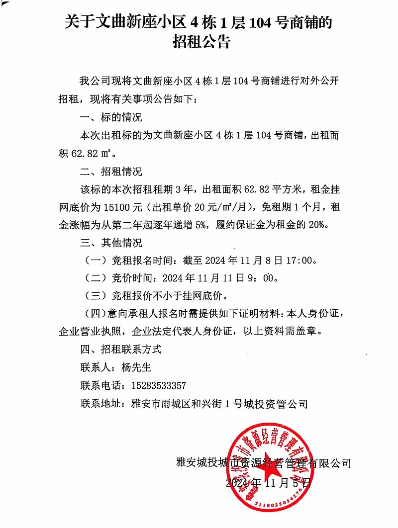 關于文曲新座小區(qū)4棟1層104號商鋪的招租公告