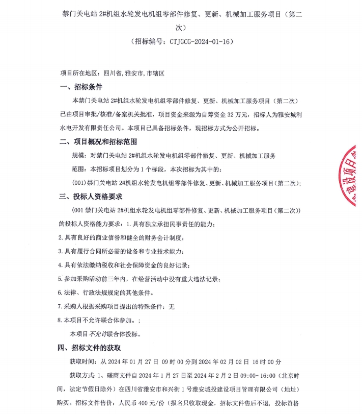 禁門關(guān)電站2#機組水輪發(fā)電機組零部件修復、更新、機械加工服務項目(第二次)公告