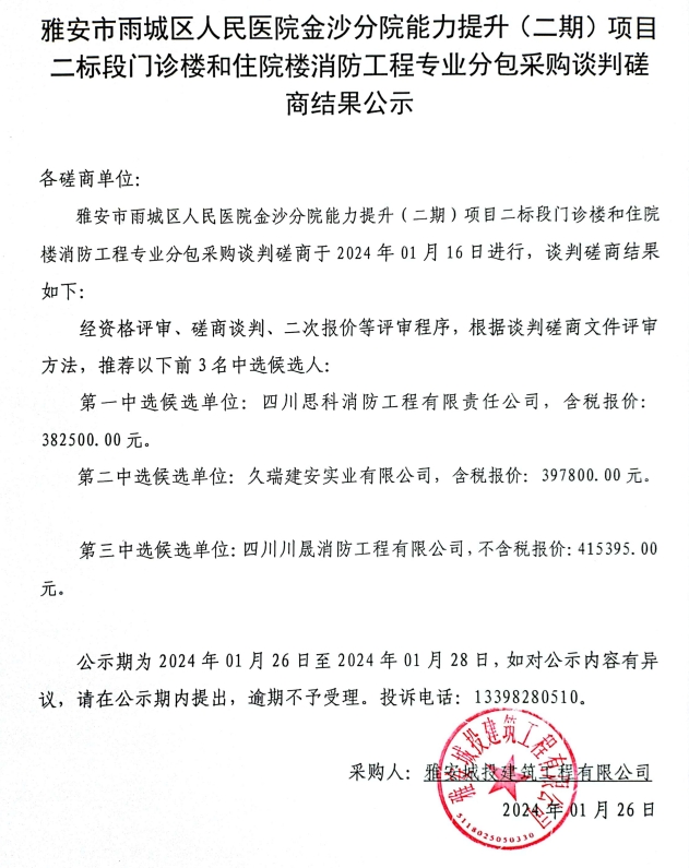 雅安市雨城區(qū)人民醫(yī)院金沙分院能力提升(二期)項(xiàng)目二標(biāo)段門(mén)診樓和住院樓消防工程專(zhuān)業(yè)分包采購(gòu)談判磋商結(jié)果公示