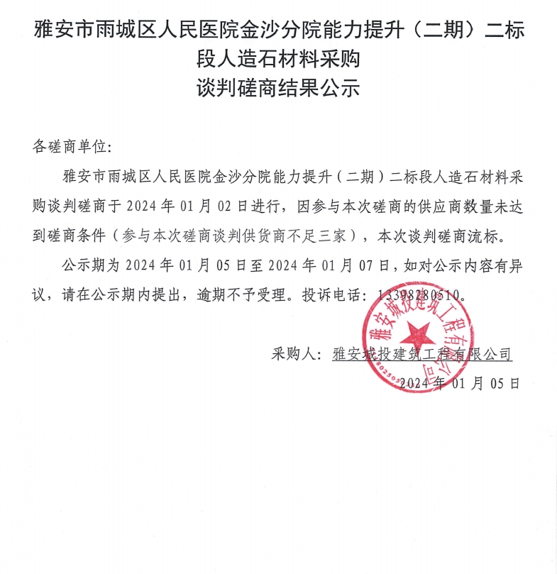 雅安市雨城區(qū)人民醫(yī)院金沙分院能力提升(二期)二標段人造石材材料采購談判磋商結(jié)果公示
