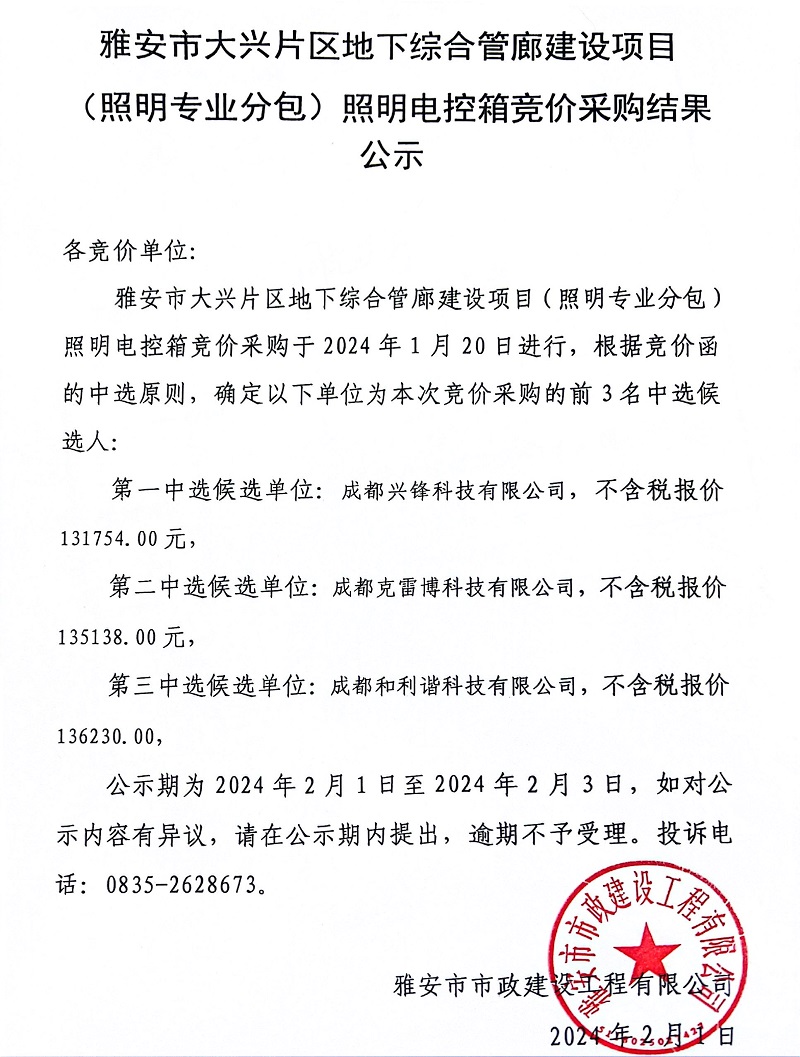 雅安市大興片區(qū)地下綜合管廊建設(shè)項(xiàng)目(照明專業(yè)分包)照明電控箱競價(jià)采購結(jié)果公示