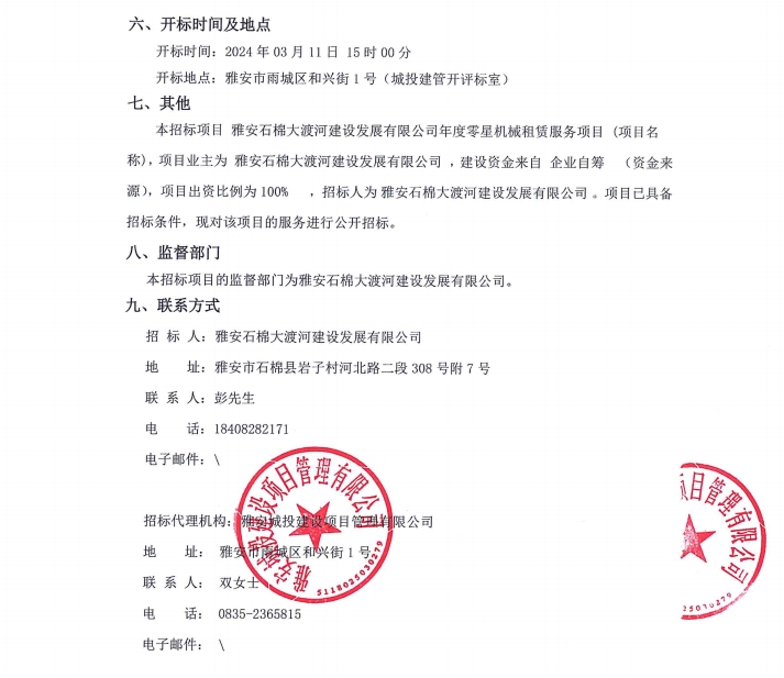 雅安石棉大渡河建設發(fā)展有限公司年度零星機械租賃服務項目公告