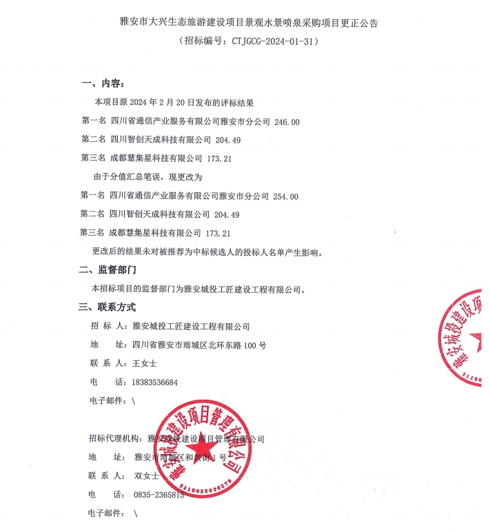 雅安市大興生態(tài)旅游建設(shè)項目景觀水景噴泉采購項目更正公告
