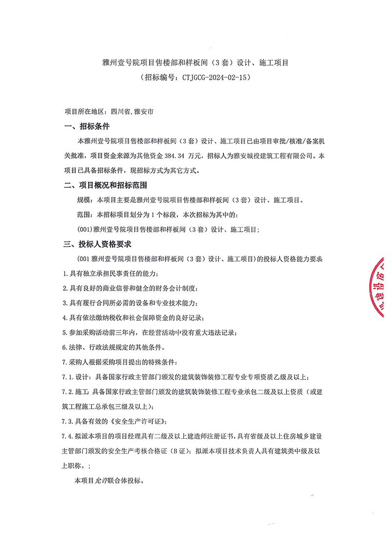 雅州壹號項(xiàng)目售樓部和樣板間(3套)設(shè)計(jì)、施工項(xiàng)目招標(biāo)公告