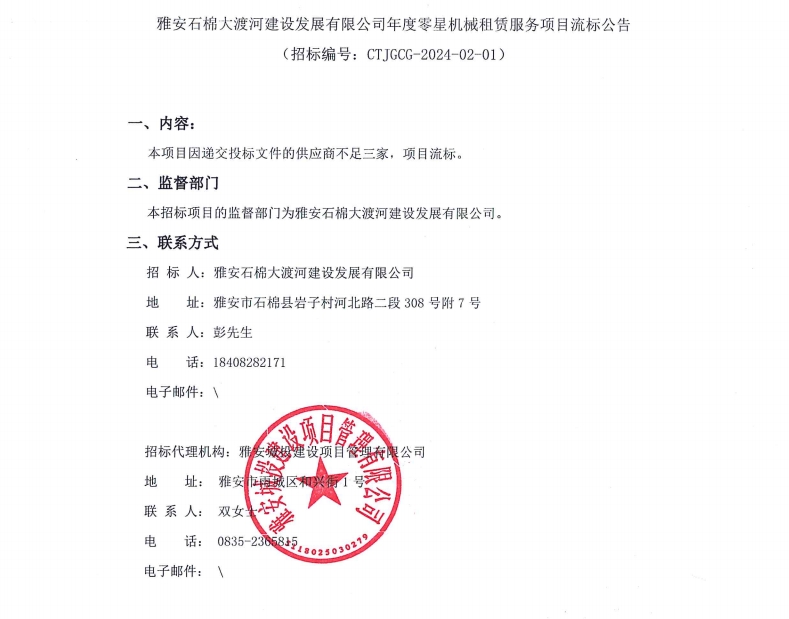 雅安石棉大渡河建設發(fā)展有限公司年度零星機械租賃服務項目流標公告