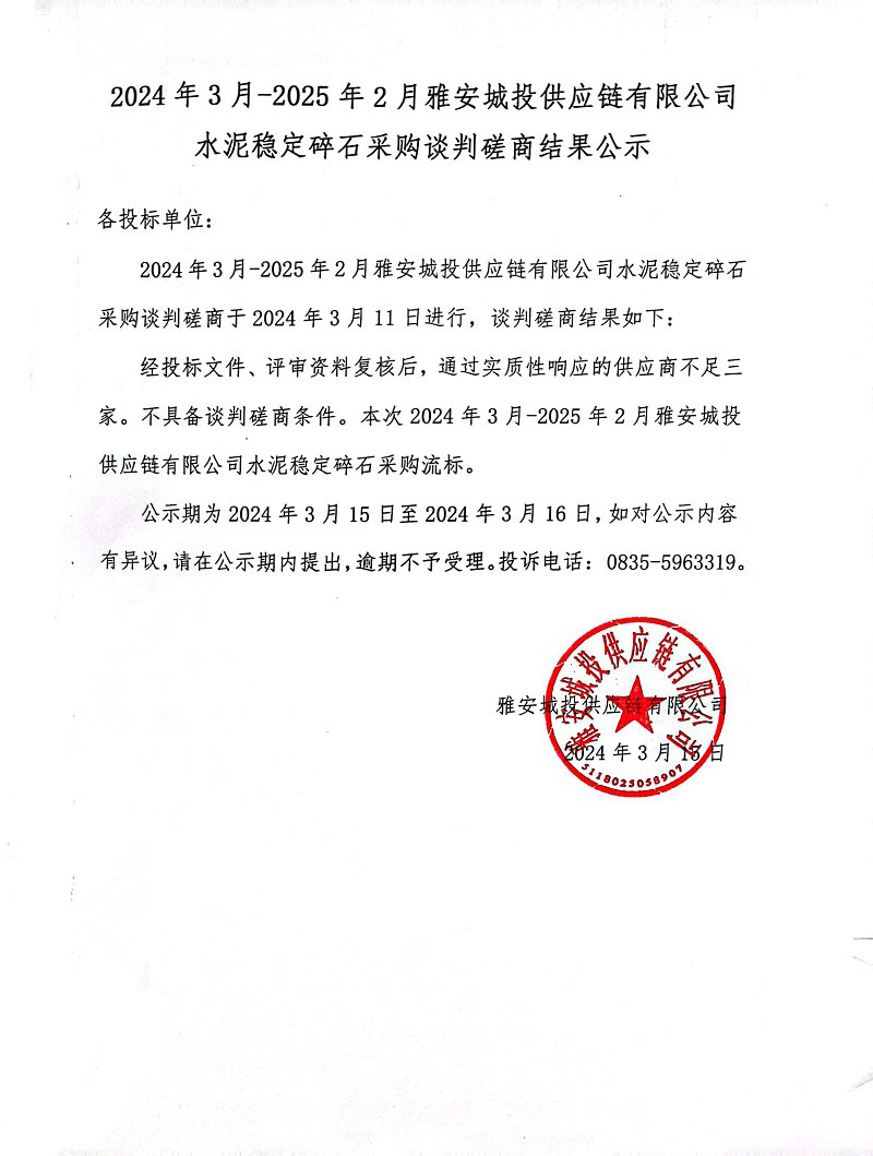 2024年3月-2025年2月雅安城投供應鏈有限公司水泥穩(wěn)定碎石采購談判磋商結果公示