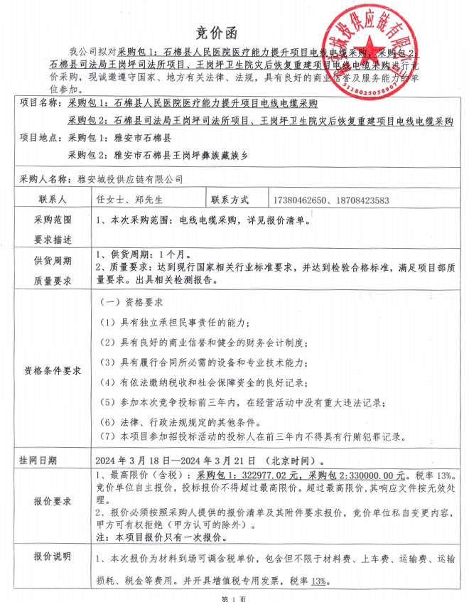 雅安城投供應(yīng)鏈有限公司電線(xiàn)電纜采購(gòu)競(jìng)價(jià)公告