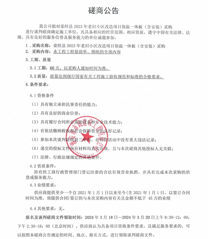 滎經(jīng)縣2023年老舊小區(qū)改造項目保溫一體(含安裝)磋商公告