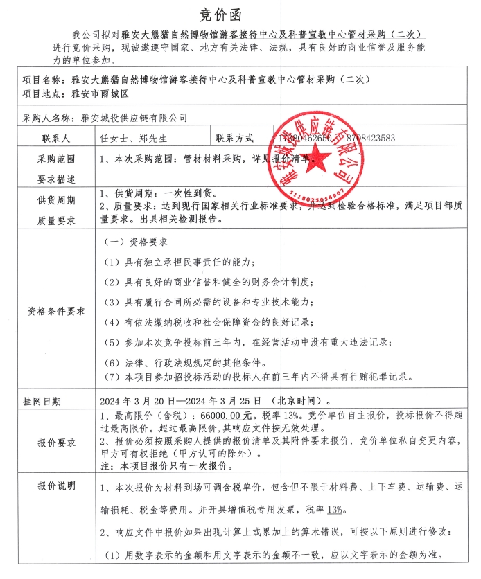 雅安大熊貓自然博物館游客接待中心及科普宣教中心管材采購(二次)競價(jià)公告