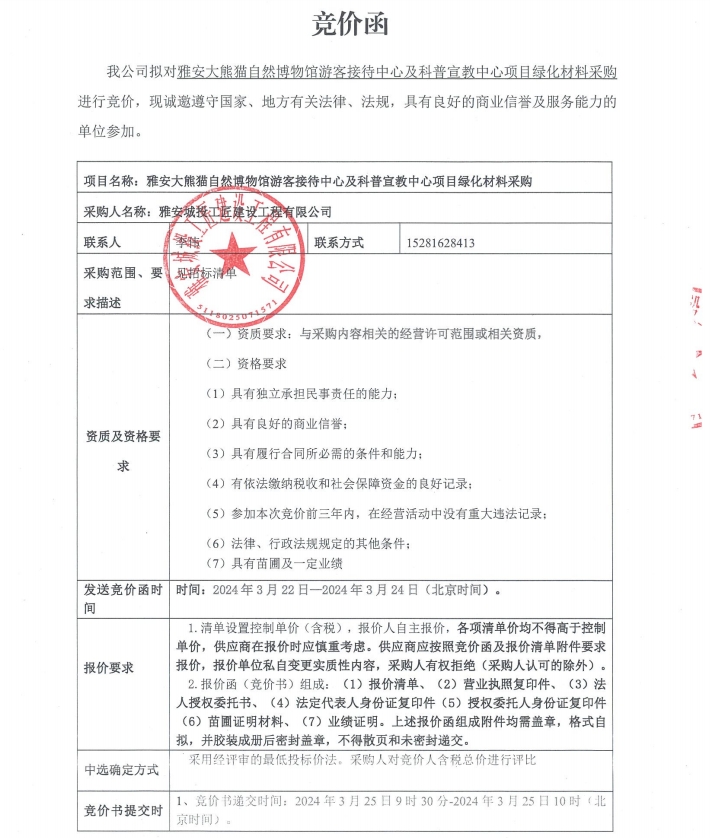 雅安大熊貓自然博物館游客接待中心及科普宣教中心項目綠化材料采購競價公告