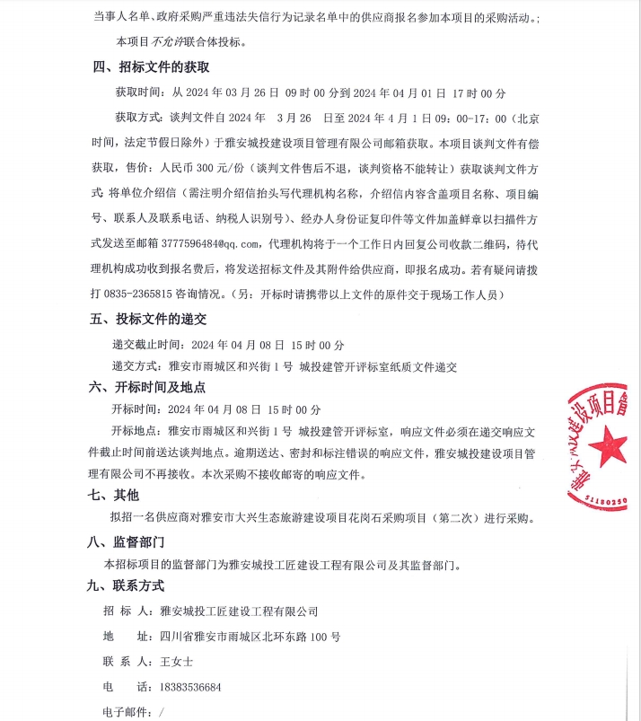 雅安市大興生態(tài)旅游建設(shè)項(xiàng)目花崗石采購項(xiàng)目(第二次)公告