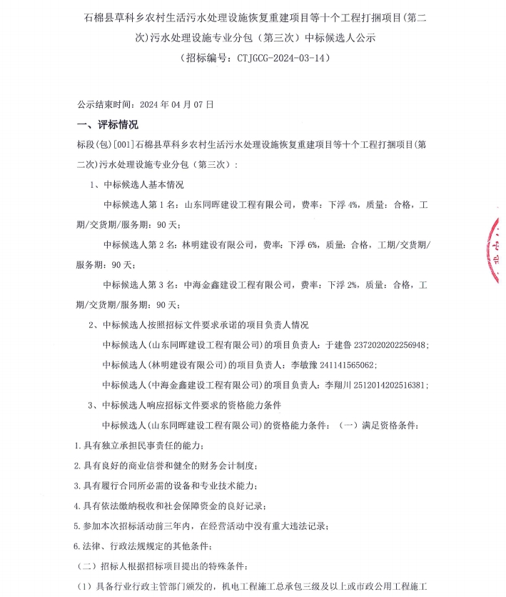 石棉縣草科鄉(xiāng)農(nóng)村生活污水處理設(shè)施恢復(fù)重建項(xiàng)目等十個(gè)工程打捆項(xiàng)目(第二次)污水處理設(shè)施專業(yè)分包(第三次)中標(biāo)候選人公示