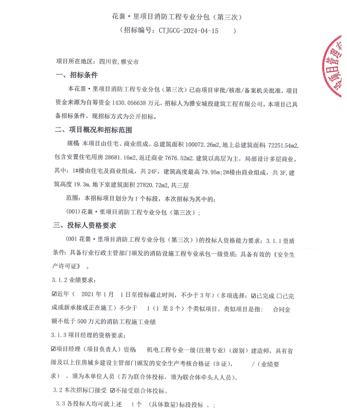 花襄·里項(xiàng)目消防工程專業(yè)分包(第三次)公告