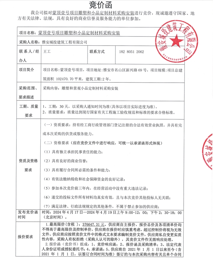 蒙頂壹號(hào)項(xiàng)目雕塑和小品定制材料采購安裝競(jìng)價(jià)公告