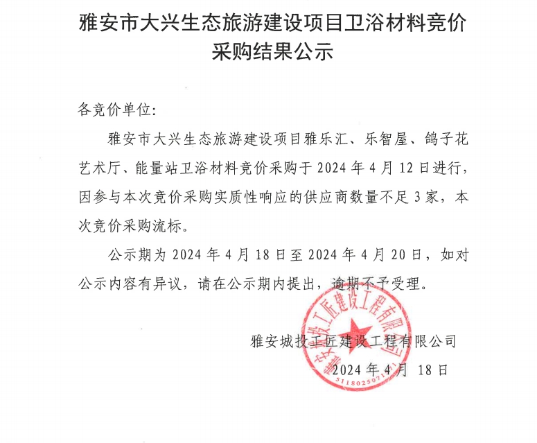 雅安市大興生態(tài)旅游建設(shè)項(xiàng)目衛(wèi)浴材料競價(jià)采購結(jié)果公示