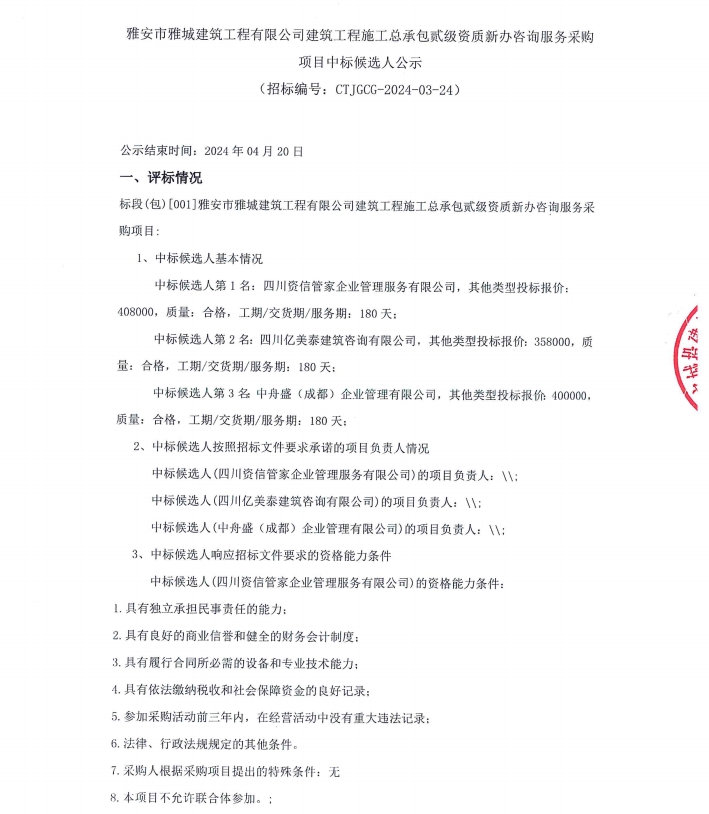 雅安市雅城建筑工程有限公司建筑工程施工總承包貳級資質(zhì)新辦咨詢服務(wù)采購項目中標(biāo)候選人公示