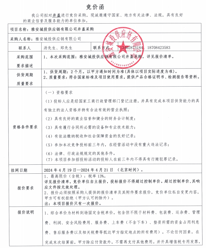 附件2:報(bào)價(jià)清單-雅安城投供應(yīng)鏈有限公司井蓋采購(gòu)