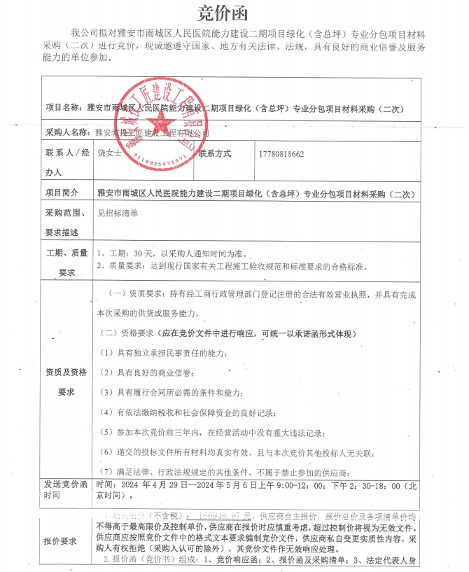 雅安市雨城區(qū)人民醫(yī)院能力建設(shè)二期項目綠化(含總坪)專業(yè)分包項目材料采購(二次)競價公告