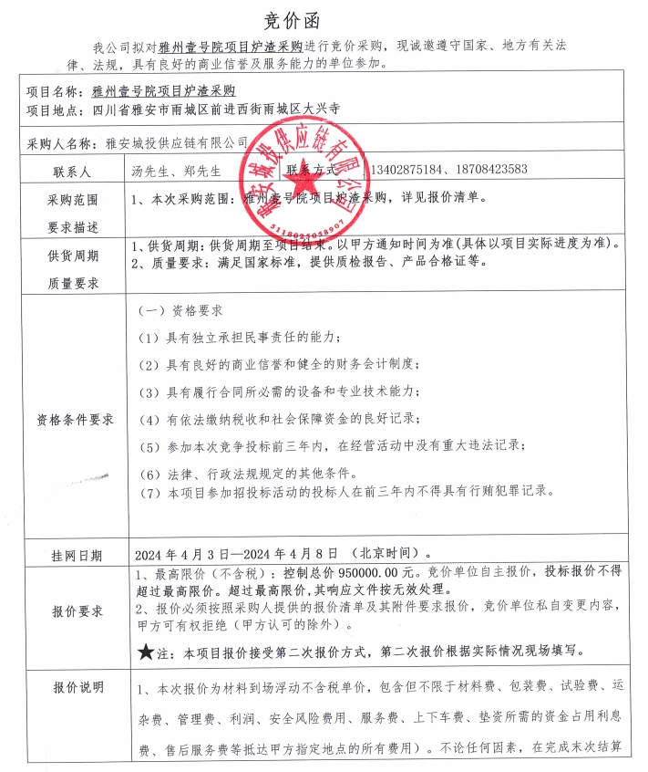 雅州壹號院項目爐渣采購競價公告