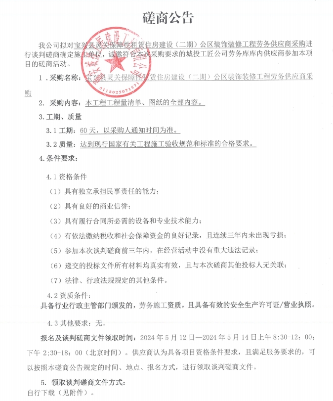 寶興縣靈關(guān)保障性租賃住房建設(shè)(二期)公區(qū)裝飾裝修工程勞務(wù)供應(yīng)商采購(gòu)談判磋商公告