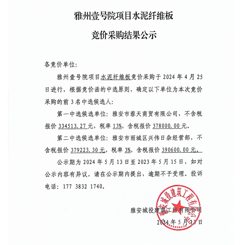 雅州壹號院項(xiàng)目水泥纖維板競價(jià)采購結(jié)果公示