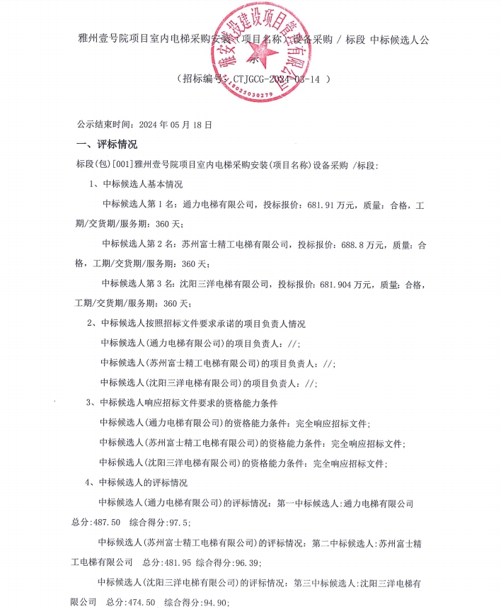 雅州壹號(hào)院項(xiàng)目室內(nèi)電梯采購安裝(項(xiàng)目名稱)設(shè)備采購/標(biāo)段中標(biāo)候選人公示