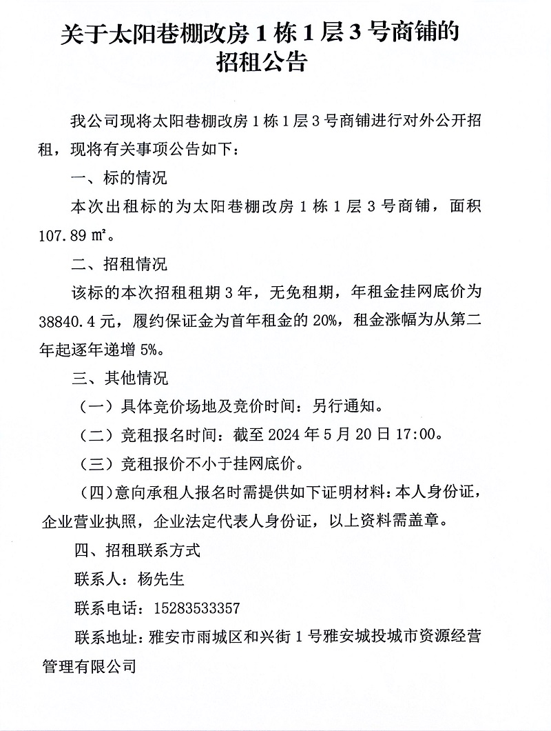 關(guān)于太陽巷棚改房1棟1層3號商鋪的招租公告