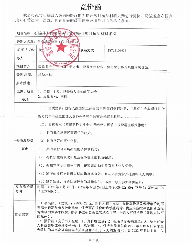 石棉縣人民醫(yī)院醫(yī)療能力提升橋架材料采購競價(jià)公告