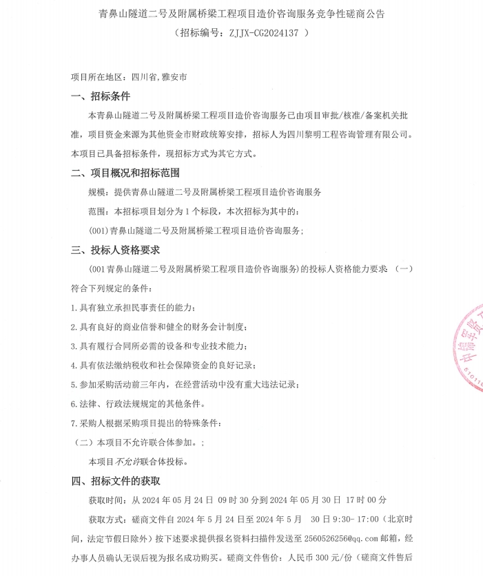 青鼻山隧道二號及附屬橋梁工程項(xiàng)目造價咨詢服務(wù)競爭性磋商公告