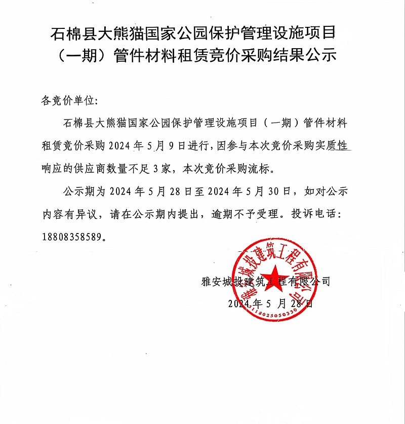 石棉縣大熊貓國(guó)家公園保護(hù)管理設(shè)施項(xiàng)目(一期)管件材料租賃競(jìng)價(jià)采購(gòu)結(jié)果公示