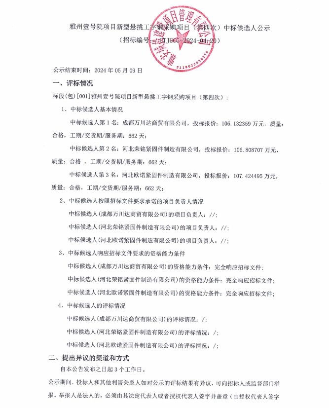 雅州壹號(hào)院項(xiàng)目新型懸挑工字鋼采購(gòu)項(xiàng)目(第四次)中標(biāo)候選人公示