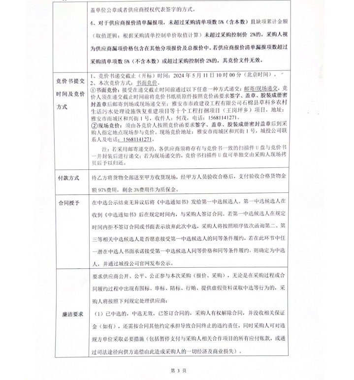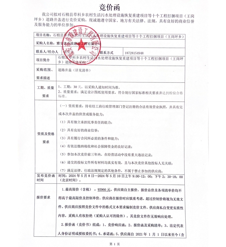 石棉縣草科鄉(xiāng)農(nóng)村生活污水處理設(shè)施恢復(fù)重建項目等十個工程打捆項目(王崗坪鄉(xiāng))道路井蓋競價公告