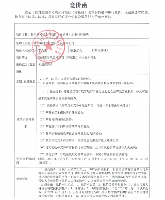 雅州壹號院總坪項(xiàng)目(樣板段)水電材料采購競價(jià)公告