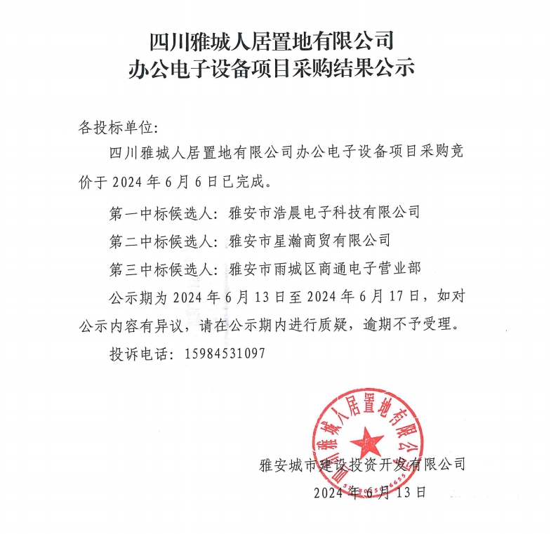 四川雅城人居置地有限公司辦公電子設備項目采購結果公示