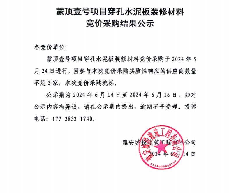蒙頂壹號(hào)項(xiàng)目穿孔水泥板裝修材料競(jìng)價(jià)采購(gòu)結(jié)果公示