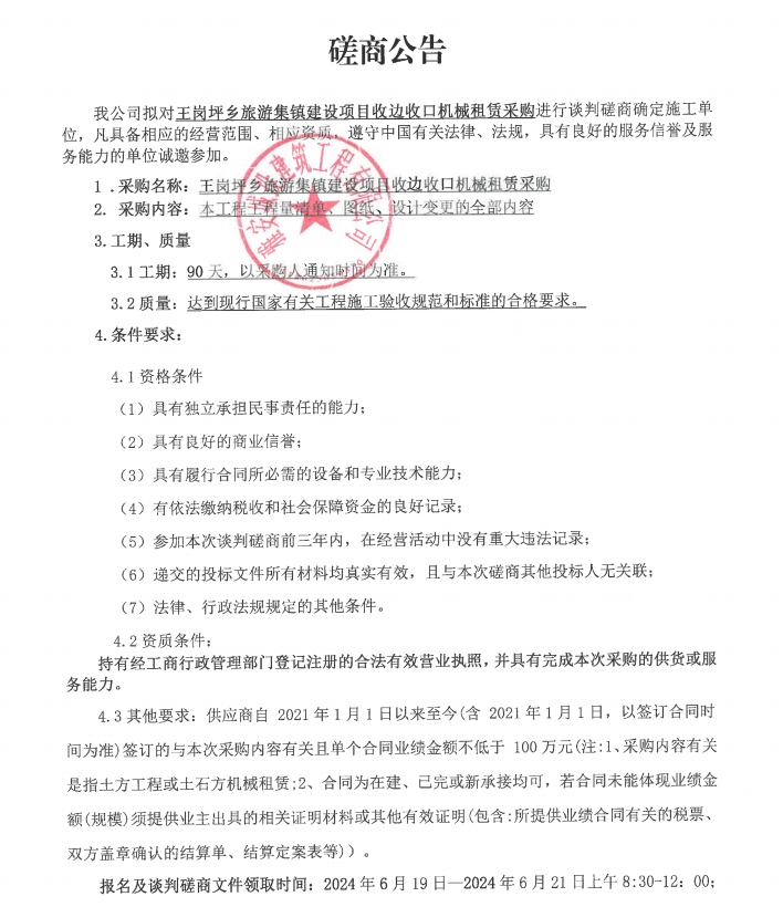 王崗坪鄉(xiāng)旅游集鎮(zhèn)建設(shè)項目收邊收口機械租賃采購談判磋商公告