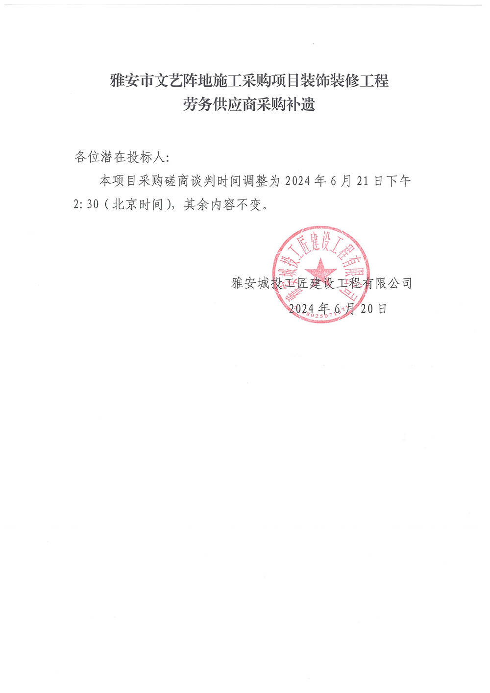 雅安市文藝陣地施工采購項目裝飾裝修工程勞務(wù)供應(yīng)商采購補遺