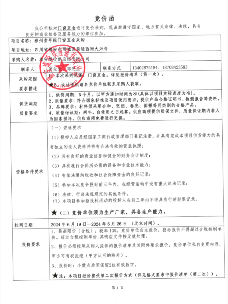 雅州壹號院門窗五金采購競價公告