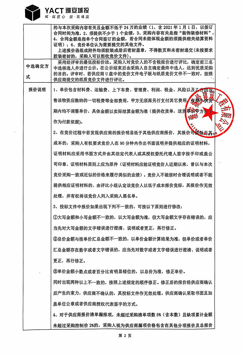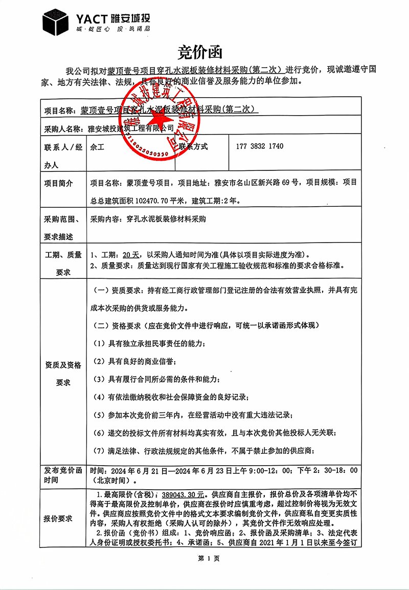 蒙頂壹號項(xiàng)目穿孔水泥板裝修材料采購(第二次)競價(jià)函