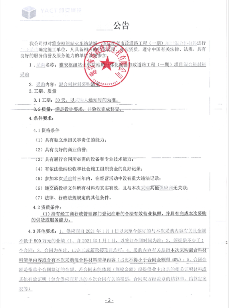 雅安樞紐站火車站站城一體化配套市政道路工程(一期)項(xiàng)目混合材料采購(gòu)公告