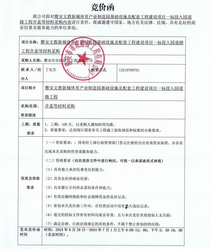 雅安文教新城體育產(chǎn)業(yè)制造園基礎(chǔ)設(shè)施及配套工程建設(shè)項(xiàng)目一標(biāo)段入園道路工程項(xiàng)目井蓋等材料采購(gòu)競(jìng)價(jià)公告