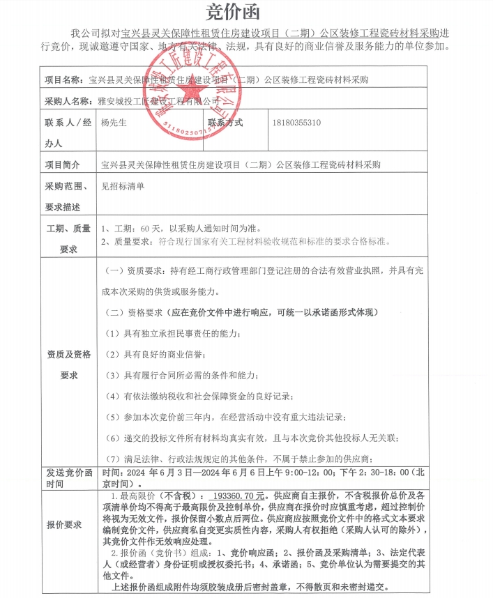 寶興縣靈關(guān)保障性租賃住房建設(shè)項目(二期)公區(qū)裝修工程瓷磚材料采購競價公告