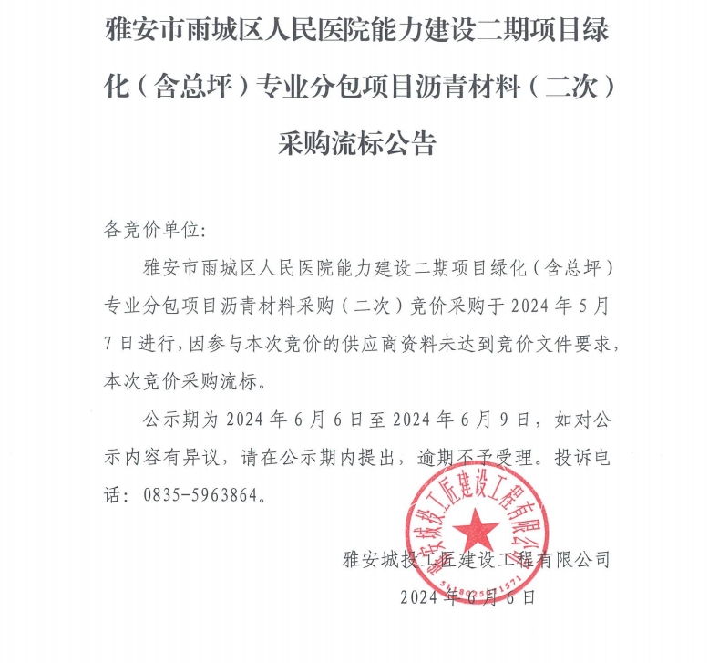 雅安市雨城區(qū)人民醫(yī)院能力建設(shè)二期項(xiàng)目綠化(含總坪)專業(yè)分包項(xiàng)目瀝青材料(二次)采購流標(biāo)公告