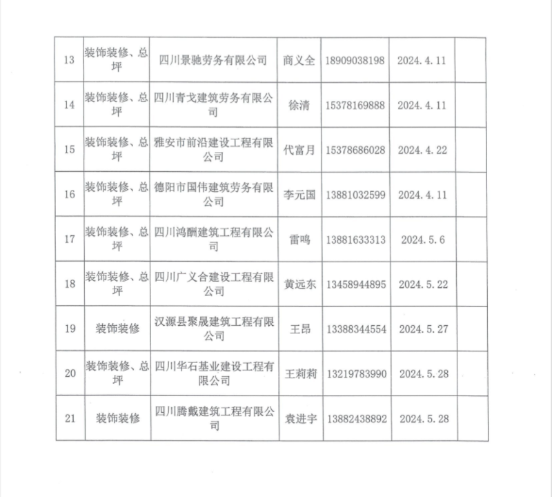 雅安城投工匠建設工程有限公司勞務供應商入庫登記表
