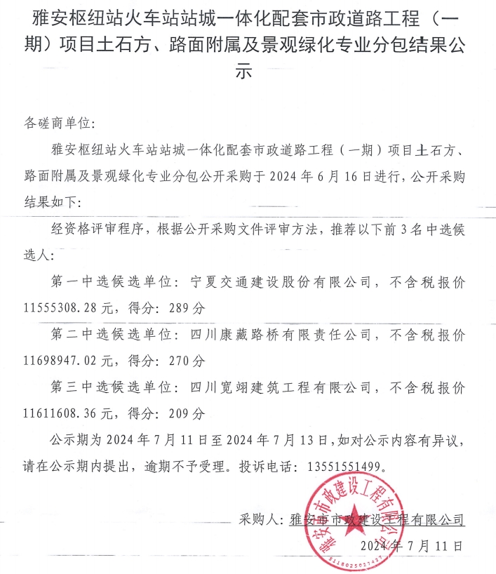 雅安樞紐站火車站站城一體化配套市政道路工程(一期)項目土石方、路面附屬及景觀綠化專業(yè)分包結果公示