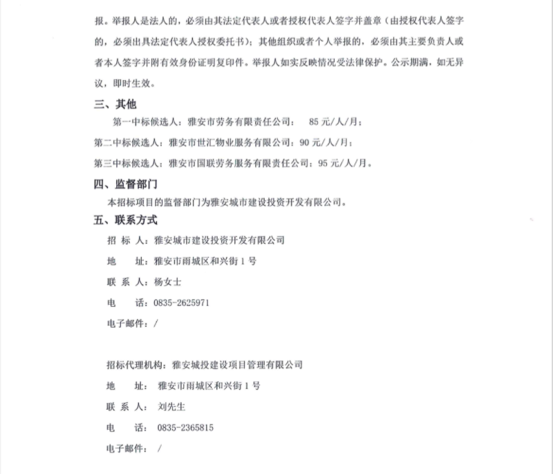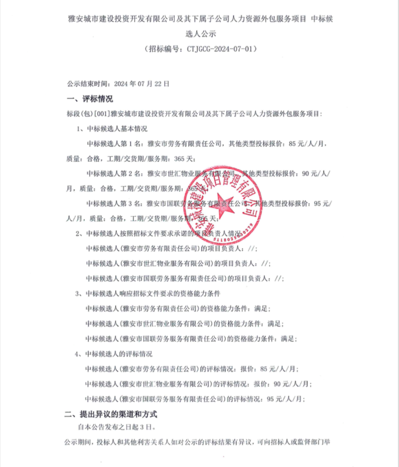 雅安城市建設(shè)投資開發(fā)有限公司及其下屬子公司人力資源外包服務(wù)項目中標候選人公示